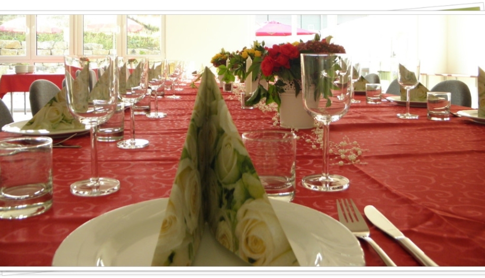 Festliche, moderne barrierefreie Räumlichkeiten, heller lichtdurchfluteter Saal, bequeme Bestuhlung, Tischwäsche, Geschirr und Gläser, Musikanlage, moderne behindertengerechte WC-Anlage, Teeküche mit 2 Flaschenkühlschränken, Gefrierschrank, Mikrowelle, Nespressomaschine und Abstellfläche für den Catering.